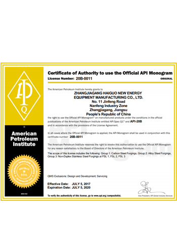公司取得了美國(guó)ABS、法國(guó)BV、中國(guó)CCS、挪威DNVGL、韓國(guó)KR、英國(guó)LR、日本NK、意大利RINA等全球八大船級(jí)社的工廠認(rèn)證證書,建立了完善的產(chǎn)品質(zhì)量管理體系。先后獲得了美國(guó)API20B資質(zhì)證書、API6A資質(zhì)證書、APIQ1體系證書、TPG的NDT認(rèn)證證書、TPG 熱處理認(rèn)證證書、歐盟PED等認(rèn)證證書,同時(shí)也通過了一些國(guó)際客戶具有高度專業(yè)要求的資格認(rèn)證。